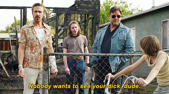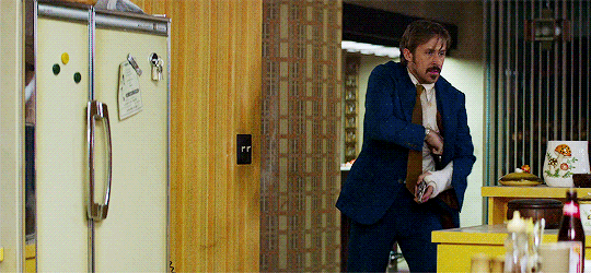 But honestly, this is one of the funniest movies I’ve watched in years. Ryan Goslings character is a dopey dickhead and Russell Crowe is a clever, good hearted, asshole and it just works. There’s so many good gags (I’ll throw in some gifs), but not enough that it cheapens the story. It’s one of those movies that keeps you interested the whole way through and a little sad when it ends.